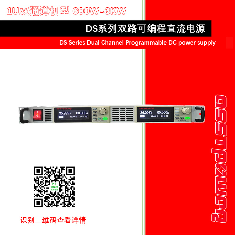 DS雙路系列高精度可編程直流電源是我公司為了滿足廣大客戶的需求推出的一款高品質(zhì)、高功率密度、多功能的高性價比產(chǎn)品,雙路獨(dú)立顯示,獨(dú)立控制,總功率最大3000W的功率密度僅1U尺寸,每路電壓最高可到1000V,電流最大可到100A,輸入工作電壓支持交流與直流兩種模式,是需要寬范圍輸出電壓或電流范圍調(diào)節(jié)應(yīng)用的理想輸出,具有恒電壓CV和恒電流CC兩種工作模式??梢詰?yīng)用在自動測試,過程控制,電池充電及老化測試等需要高質(zhì)量直流穩(wěn)定電源的產(chǎn)場合,本系列產(chǎn)品具有零電壓“軟開關(guān)”功能,可實減小開關(guān)瞬變應(yīng)力,從而具有很低的輸出噪聲。軟開關(guān)也可以提高效率,減小熱量,從而使電源具有更高的穩(wěn)定性。